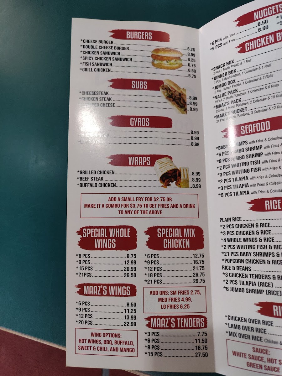 Welcome to Maaz’s Chicken, the go-to halal eatery nestled in Franklin, NH. This vibrant establishment brings together mouth-watering flavors and a welcoming atmosphere, making it an ideal spot for fast, delicious meals. The menu is a celebration of well-executed comfort food, featuring standout dishes like perfectly fried chicken, succulent lamb gyros, and hearty Philly cheesesteaks.